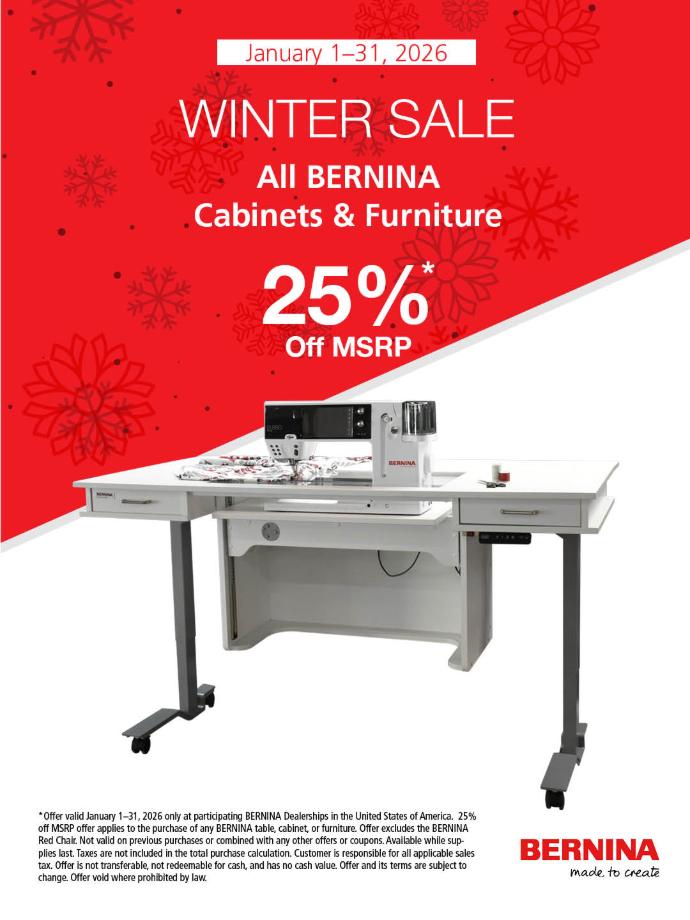 There are sales on various new BERNINA Machines and Furniture, as some great deals on Floor Models.